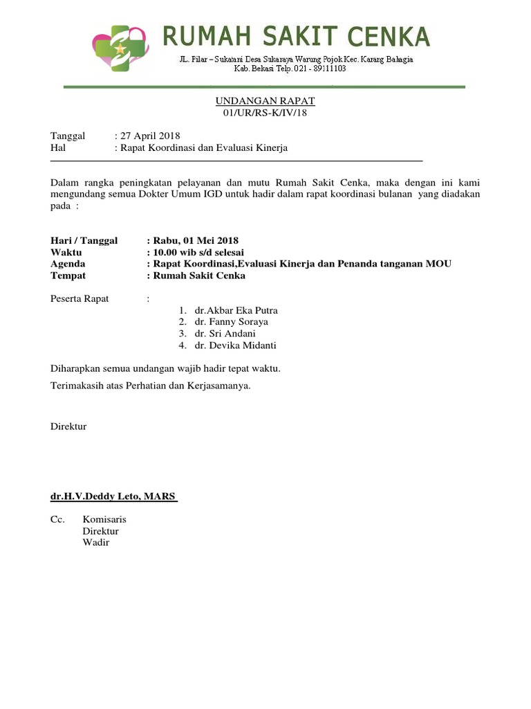 Sebuah organisasi atau instansi pasti sering mengadakan rapat. Mungkin kebanyakan dari kita telah mengenal dengan jenis surat yang satu ini. Demikian pemberitahuan surat undangan ini kami sampaikan, diharapkan saudara untuk hadir tepat waktu mengingat rapat evaluasi anggaran ini sangat penting terutama bagi kinerja karyawan dan perusahaan. Dalam pelaksanaan suatu kegiatan rapat, kita tidak bisa begitu saja mengadakannya tanpa suatu. Dinas lingkungan hidup kota pontianak.